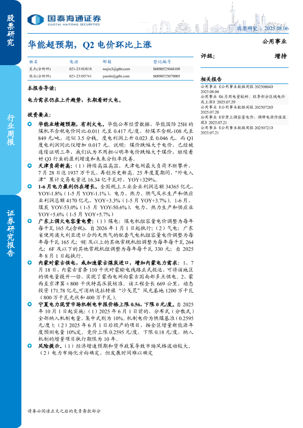 【国泰海通证券】【20250806】华能超预期,Q2电价环比上涨-2页