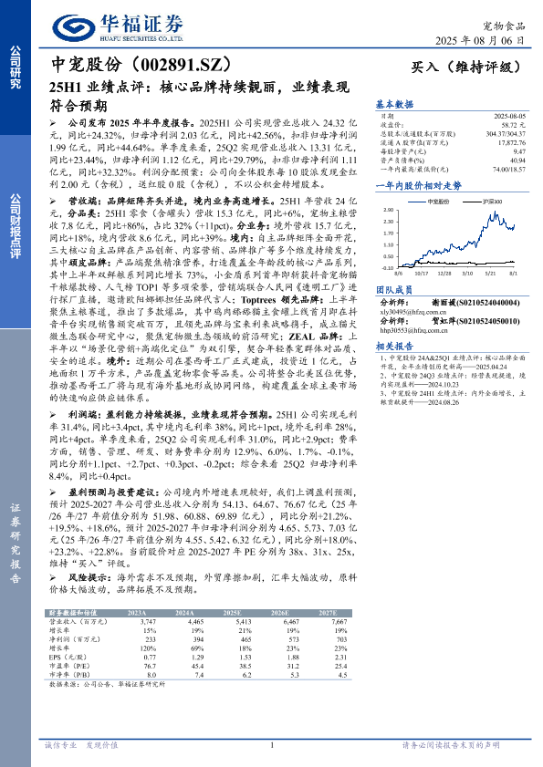 【华福证券】【20250806】中宠股份25H1业绩点评:核心品牌持续靓丽,业绩表现符合预期-3页