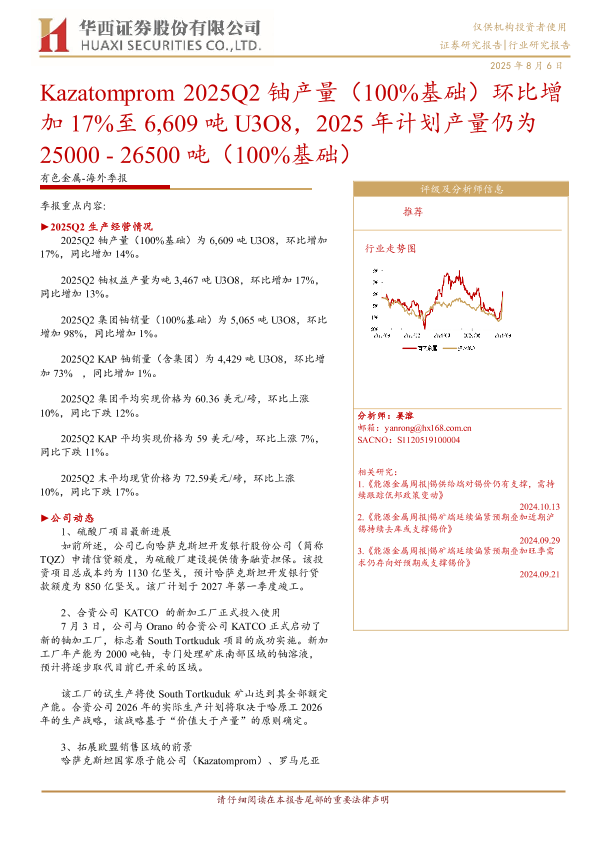 【Kazatomprom】【20250806】2025Q2铀产量(100%基础)环比增加17%至6,609吨U3O8,2025年计划产量仍为25000~26500吨(100%基础)-5页