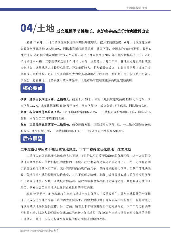 【克而瑞研究中心】【202506】房地产行业市场月报:成交规模季节性增长,京沪多宗高总价地块顺利出让-7页