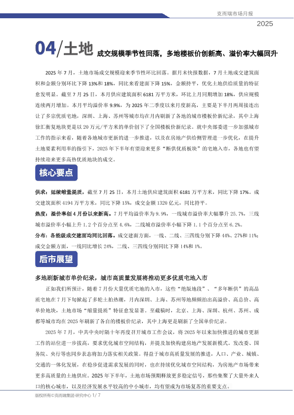 【克而瑞研究中心】【202508】成交规模季节性回落,多地楼板价创新高、溢价率大幅回升-7页