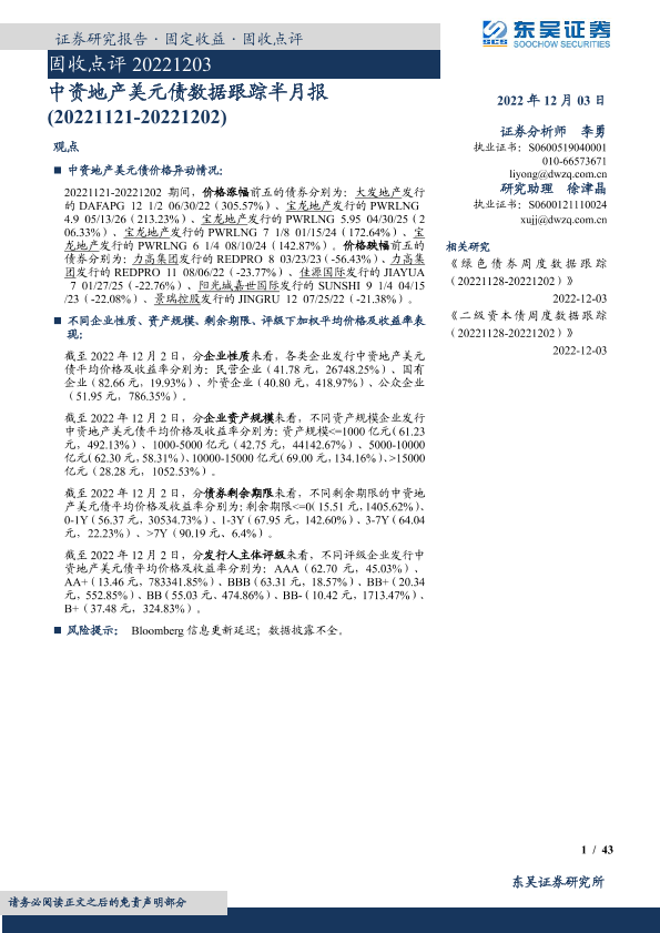 【东吴证券】【20221203】固收点评:中资地产美元债数据跟踪半月报-43页