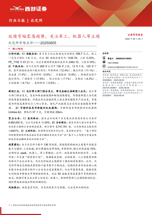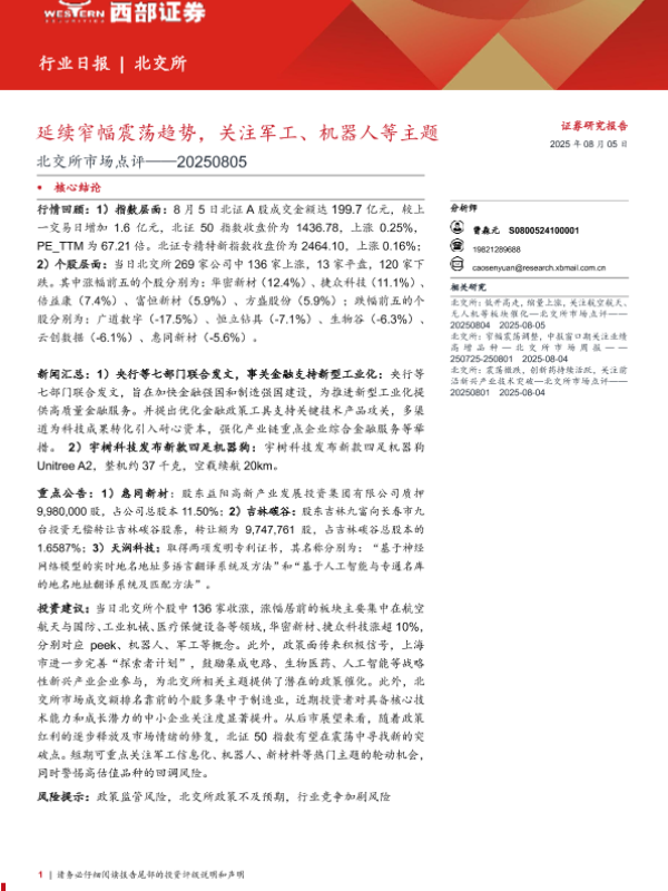 【西部证券】【20250805】北交所市场点评:延续窄幅震荡趋势,关注军工、机器人等主题-7页