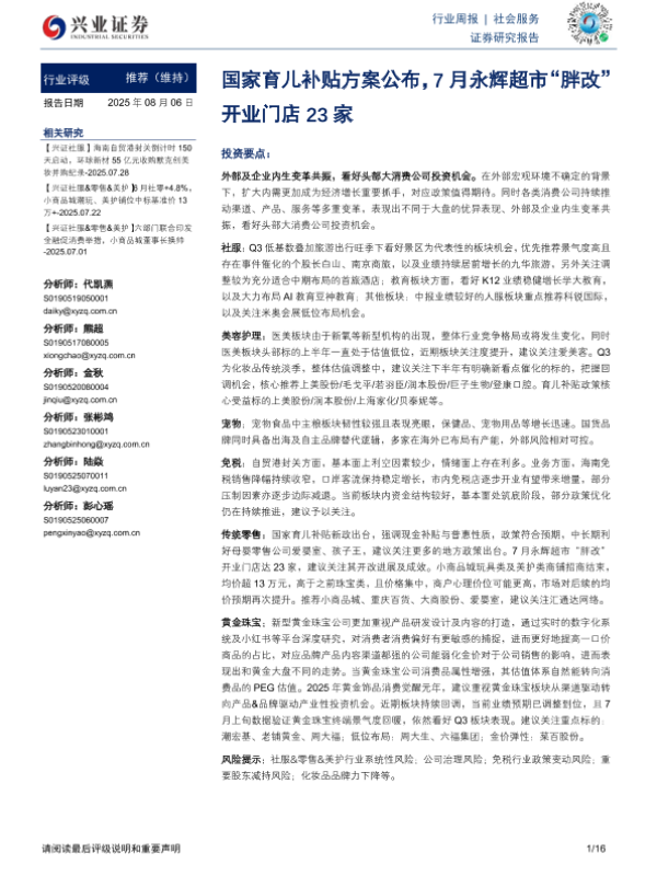 【兴业证券】【20250806】社会服务行业周报:国家育儿补贴方案公布,7月永辉超市“胖改”开业门店23家-16页