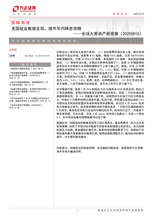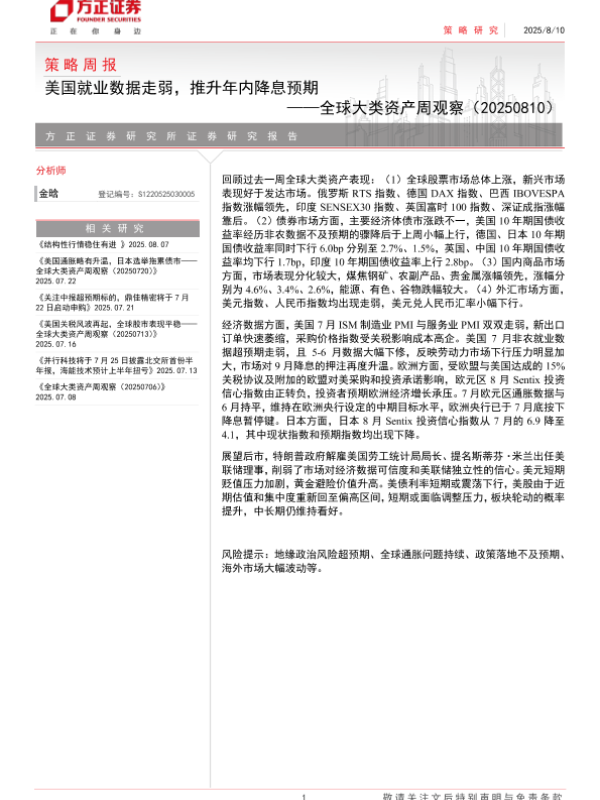 【方正证券】【20250810】全球大类资产周观察:美国就业数据走弱,推升年内降息预期-14页