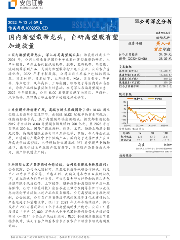 【安信证券】【20221208】国内薄型载带龙头,自研离型膜有望加速放量-22页