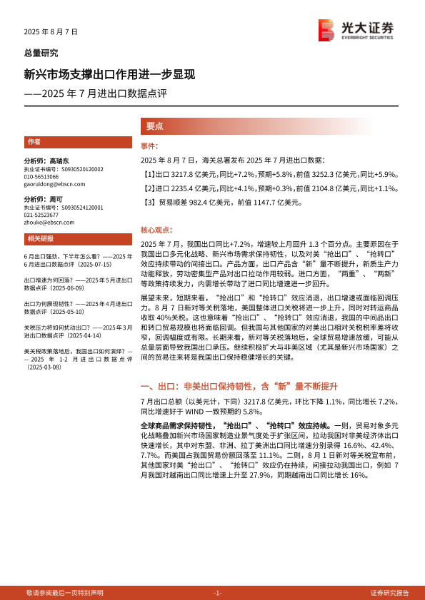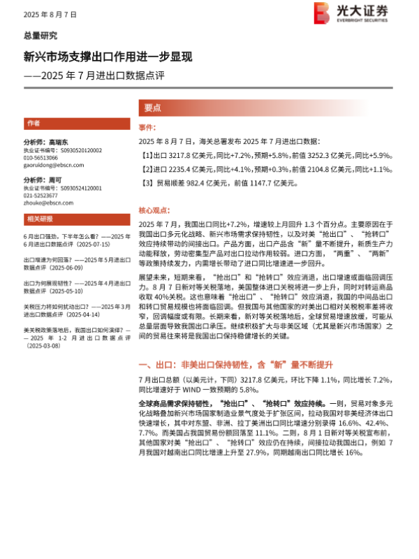 【光大证券】【20250807】2025年7月进出口数据点评:新兴市场支撑出口作用进一步显现-6页