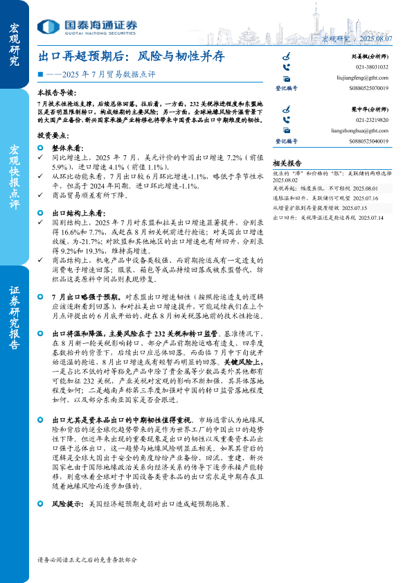 【国泰海通证券】【20250807】2025年7月贸易数据点评:出口再超预期后,风险与韧性并存-8页