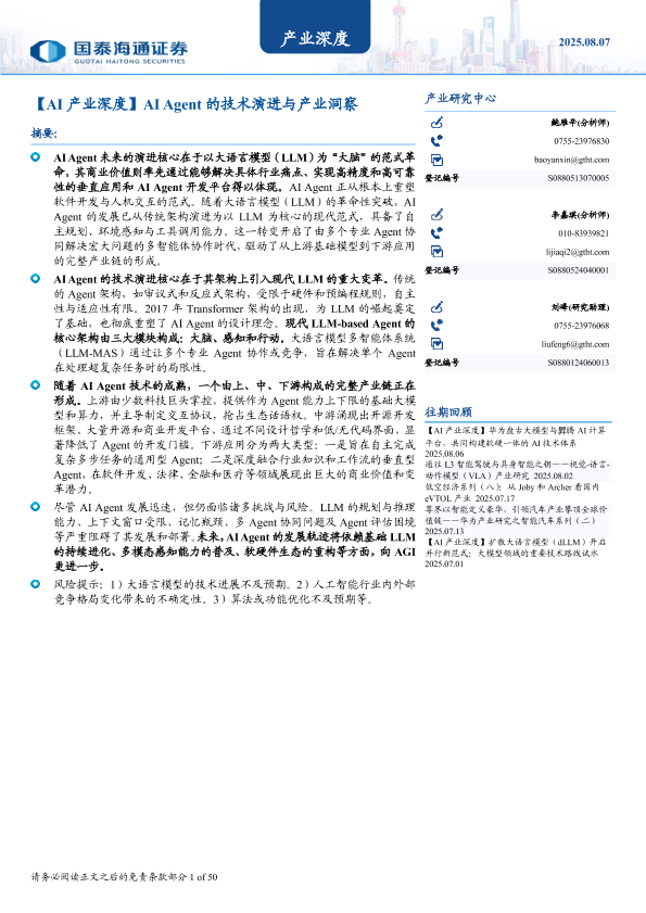 【国泰海通证券】【20250807】AI产业深度:AI Agent的技术演进与产业洞察-50页