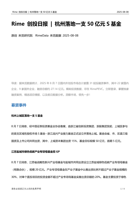 【来觅研究院】【20250808】Rime创投日报杭州落地一支50亿元S基金-4页