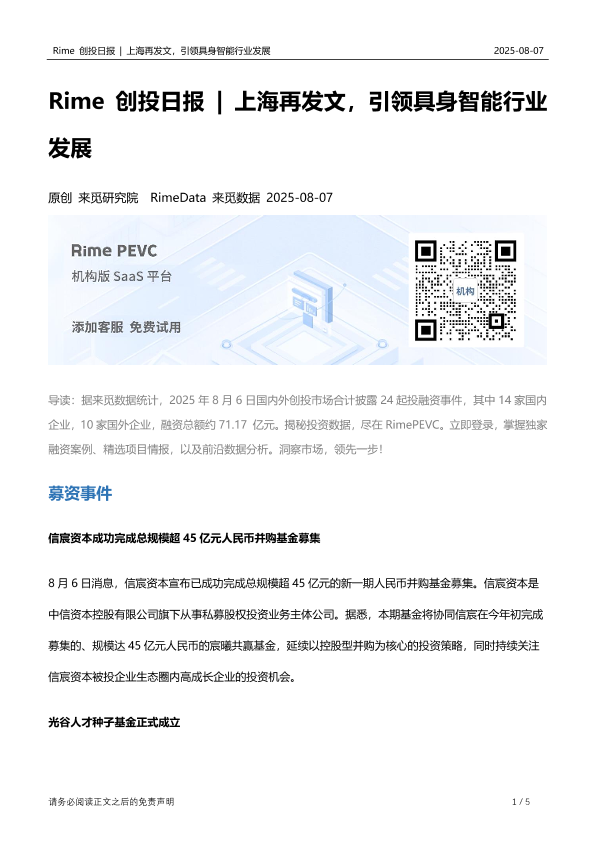 【来觅研究院】【20250807】Rime创投日报 | 上海再发文,引领具身智能行业发展-5页
