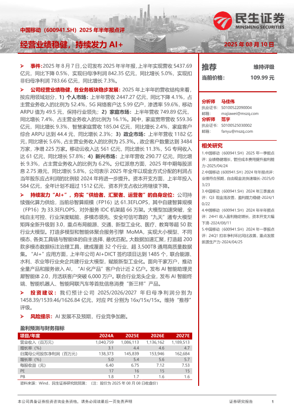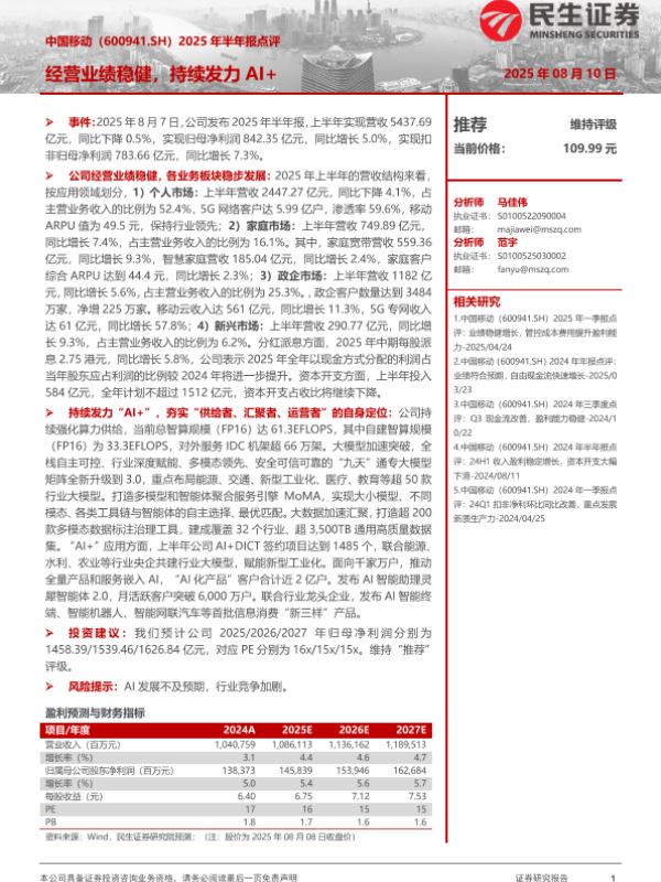 财务分析 中国移动 AI+ 经营业绩 半年报