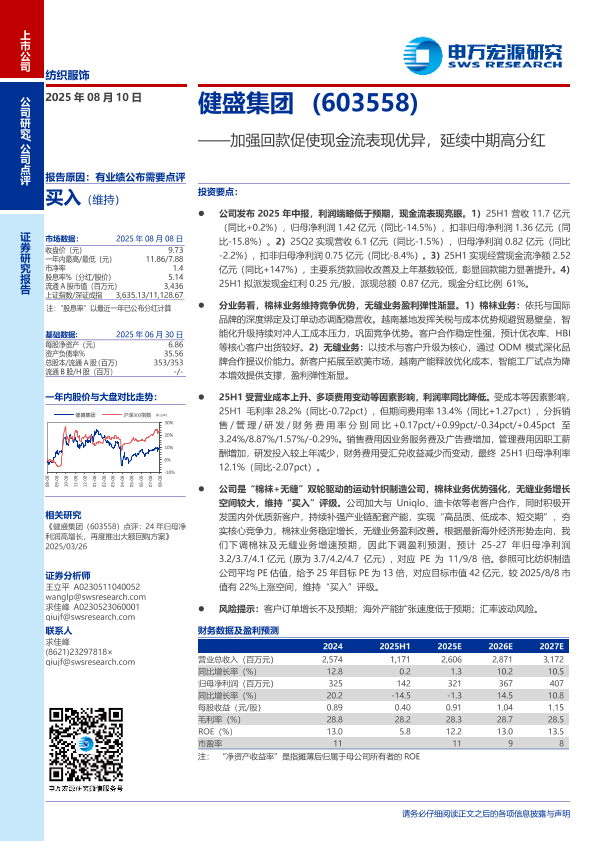 业务分析 纺织服饰 高分红 现金流表现 健盛集团