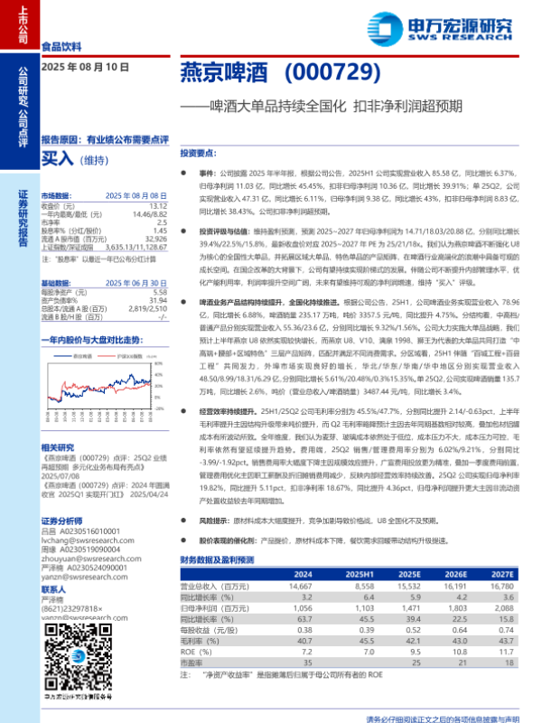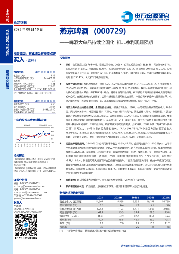 【申万宏源】【20250810】啤酒大单品持续全国化,扣非净利润超预期-3页