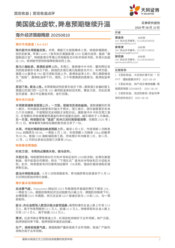 【天风证券】【20250810】海外经济跟踪周报:美国就业疲软,降息预期继续升温-17页
