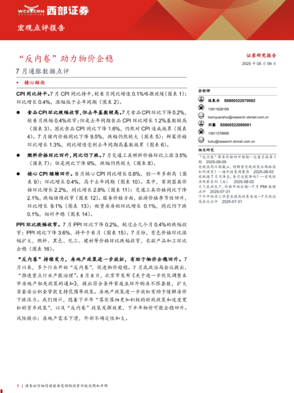 【西部证券】【20250809】7月通胀数据点评:“反内卷”助力物价企稳-6页