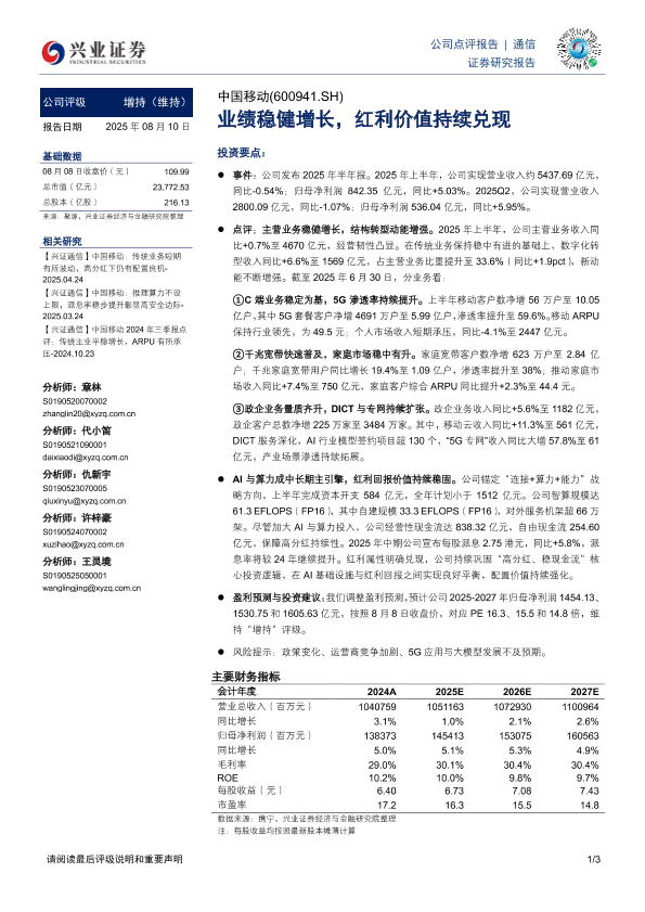 【兴业证券】【20250810】中国移动:业绩稳健增长,红利价值持续兑现-3页