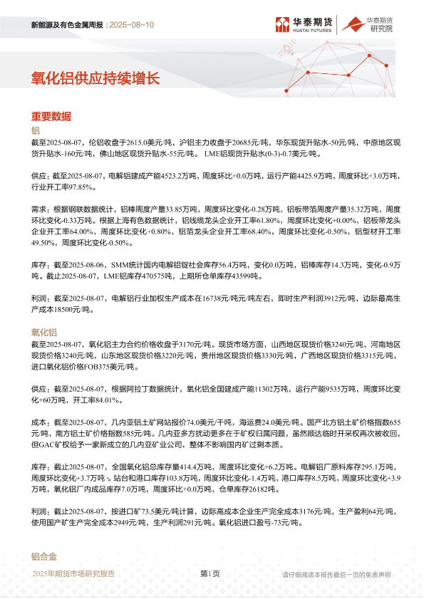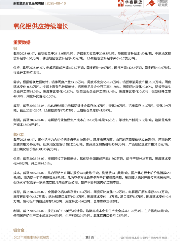 【华泰期货】【20250810】新能源及有色金属周报:氧化铝供应持续增长-13页