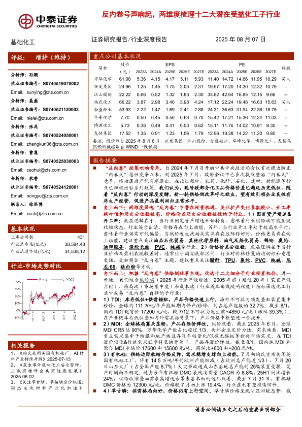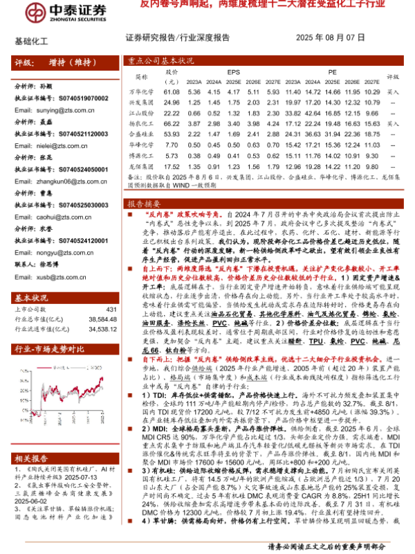 【中泰证券】【20250807】基础化工行业:反内卷号声响起,两维度梳理十二大潜在受益化工子行业-40页