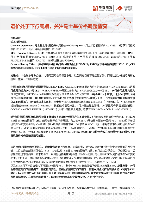 【华泰期货】【20250810】FICC周报:运价处于下行周期,关注马士基价格调整情况-14页