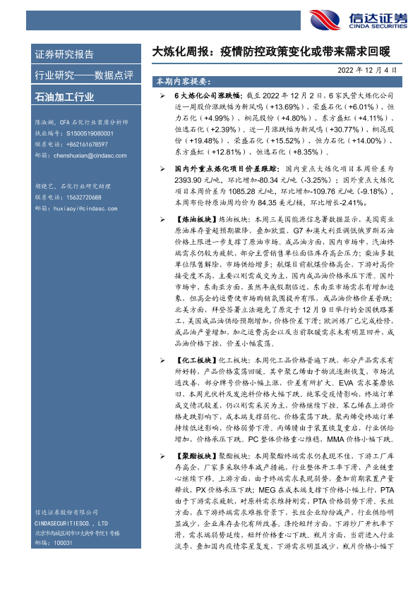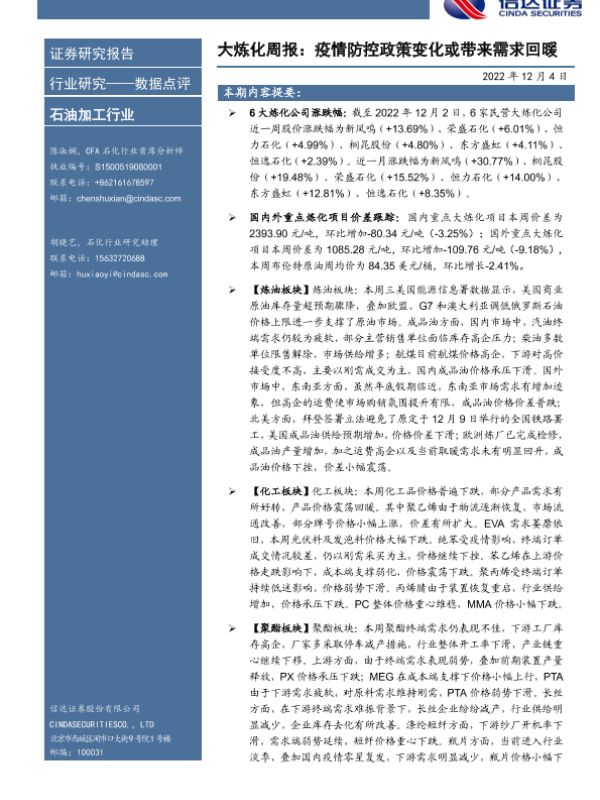 【信达证券】【20221204】大炼化周报:疫情防控政策变化或带来需求回暖-22页