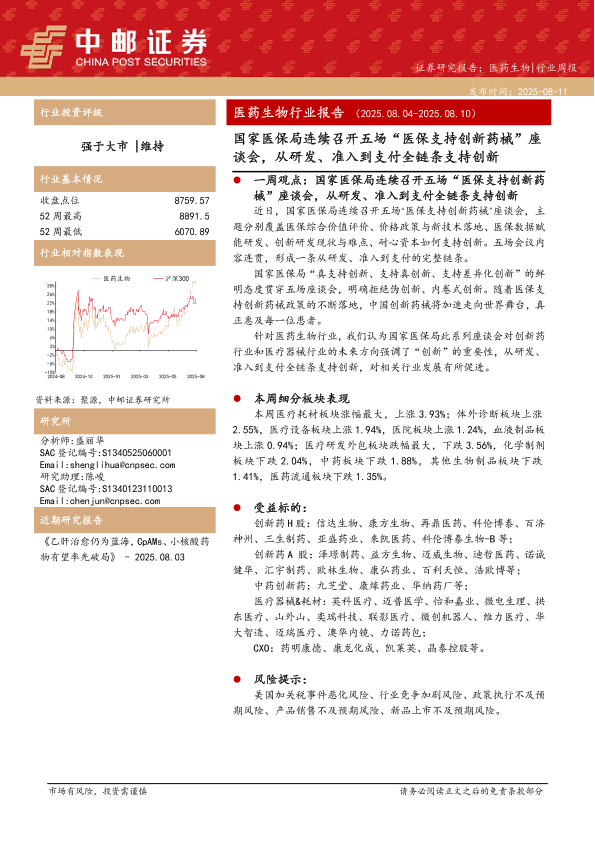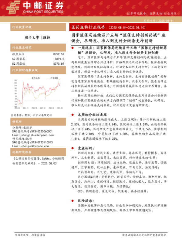 【中邮证券】【20250811】中邮证券-医药生物行业周报:国家医保局连续召开五场“医保支持创新药械”座谈会,从研发、准入到支付全链条支持创新-15页