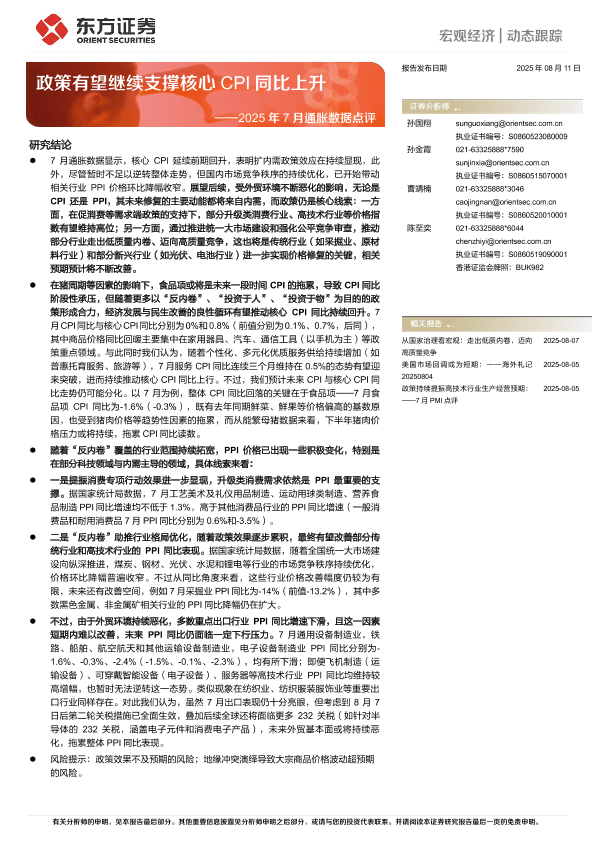 【东方证券】【20250811】2025年7月通胀数据点评:政策有望继续支撑核心CPI同比上升-5页