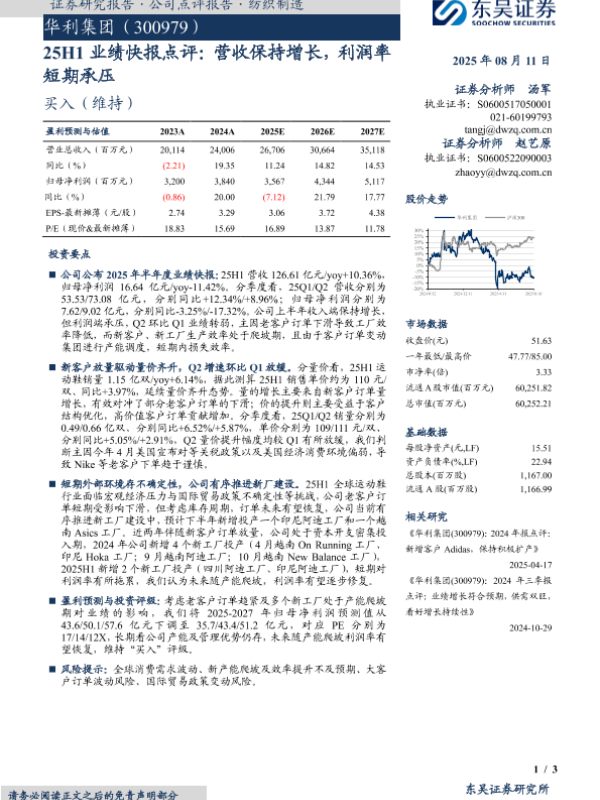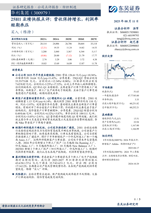 华利集团 新客户订单 工厂效率 利润率承压 营收增长