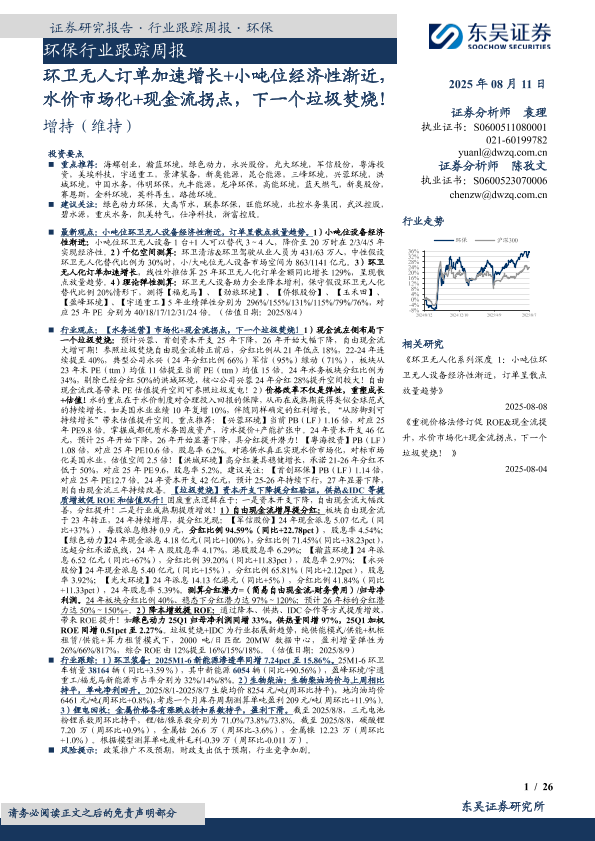 【东吴证券】【20250811】环保行业跟踪周报:环卫无人订单加速增长+小吨位经济性渐近,水价市场化+现金流拐点,下一个垃圾焚烧!-26页