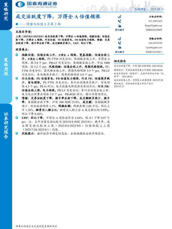 【国泰海通证券】【20250811】情绪与估值8月第2期:成交活跃度下降,万得全A估值领涨-5页