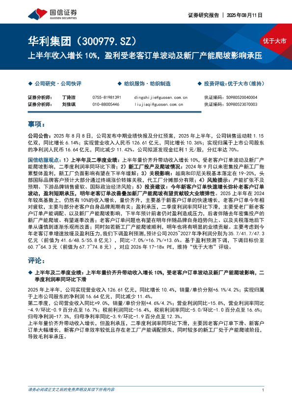 【国信证券】【20250811】华利集团-上半年收入增长10%,盈利受老客订单波动及新厂产能爬坡影响承压-7页