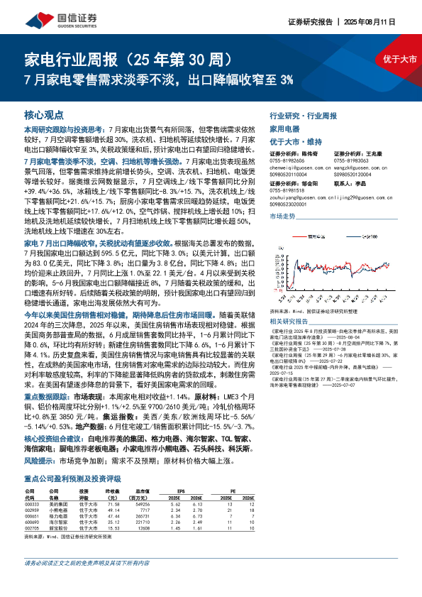 【国信证券】【20250811】家电行业周报(25年第30周):7月家电零售需求淡季不淡,出口降幅收窄至3%-14页