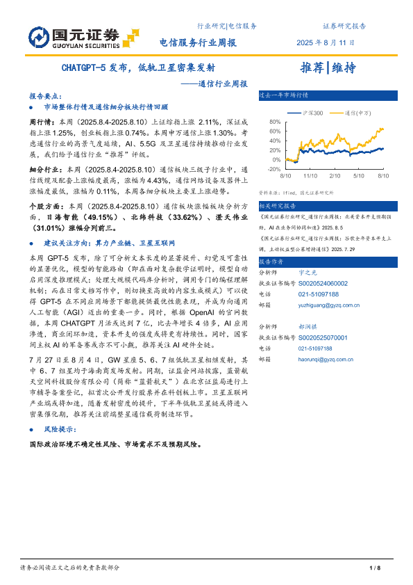 【国元证券】【20250811】通信行业周报:CHATGPT-5发布,低轨卫星密集发射-8页
