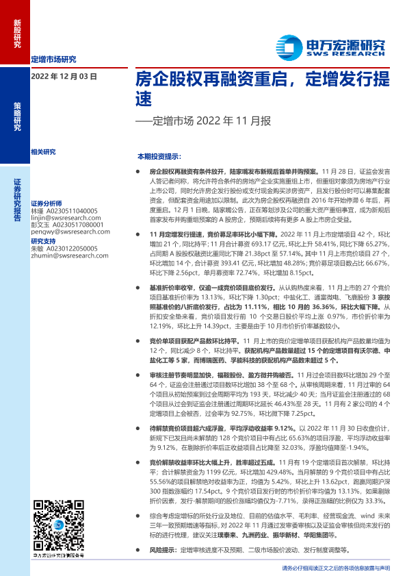 【申万宏源】【20221203】定增市场2022年11月报:房企股权再融资重启,定增发行提速-19页