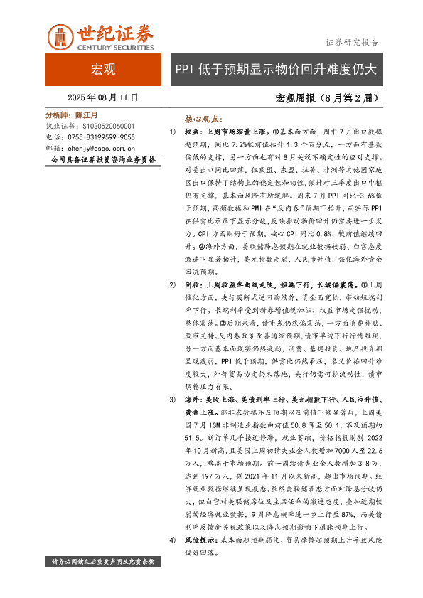 【世纪证券】【20250811】PPI低于预期显示物价回升难度仍大-6页
