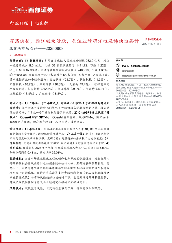 【西部证券】【20250811】北交所市场点评:震荡调整,雅江板块活跃,关注业绩确定性及稀缺性品种-7页