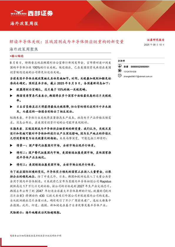 【西部证券】【20250810】海外政策周聚焦:解读半导体关税,区域国别成为半导体供应链重构的新变量-12页