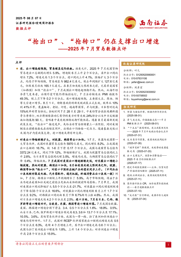 【西南证券】【20250807】2025年7月贸易数据点评:“抢出口”、“抢转口”仍在支撑出口增速-7页