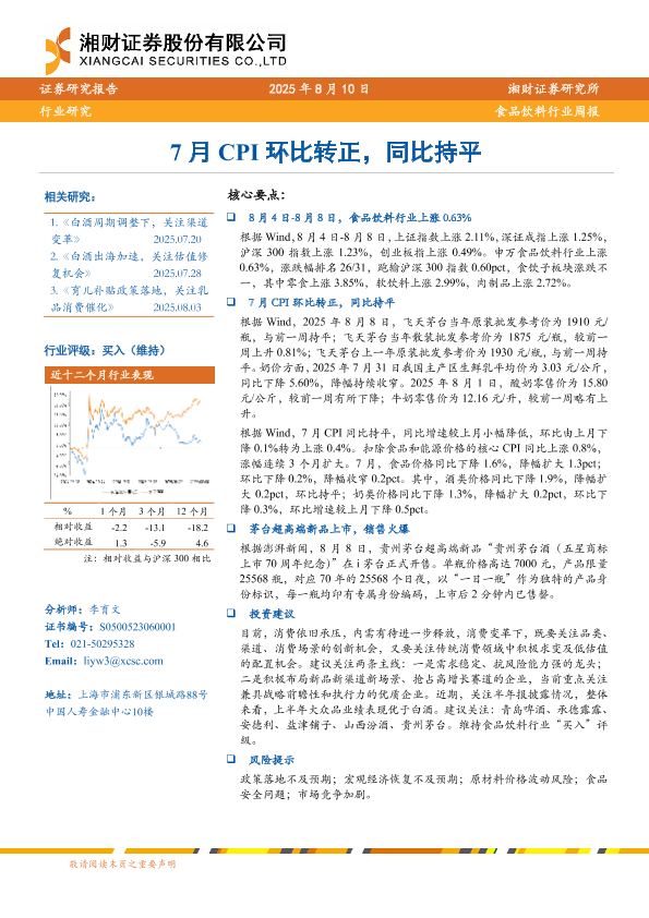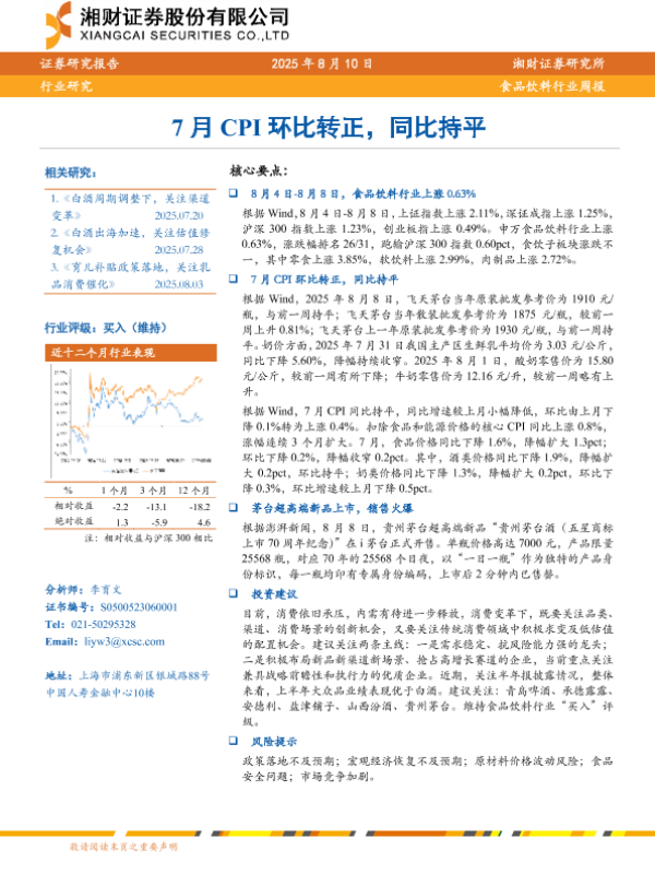 【湘财证券】【20250810】食品饮料行业周报:7月CPI环比转正,同比持平-9页