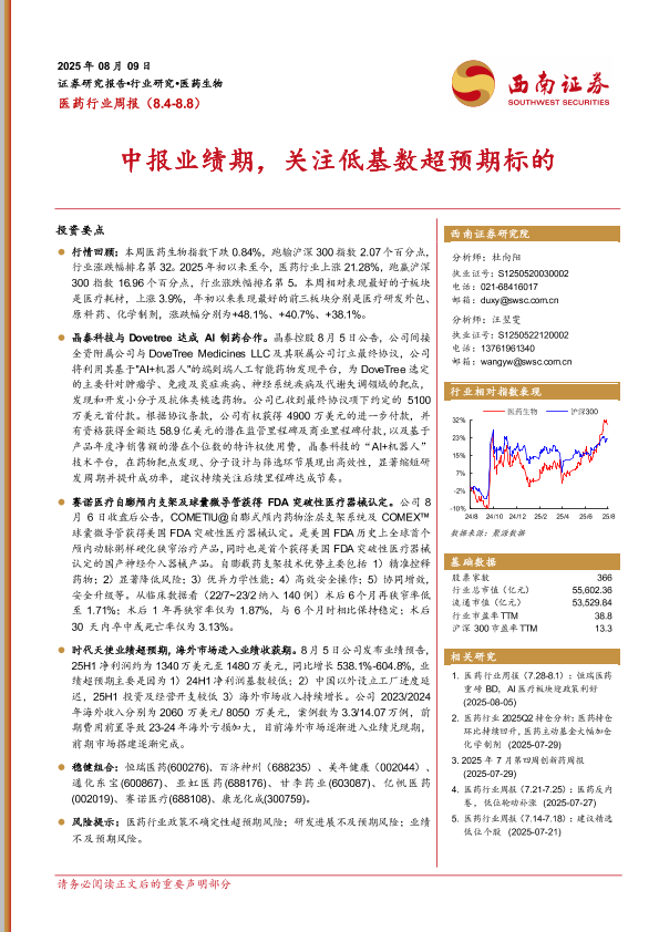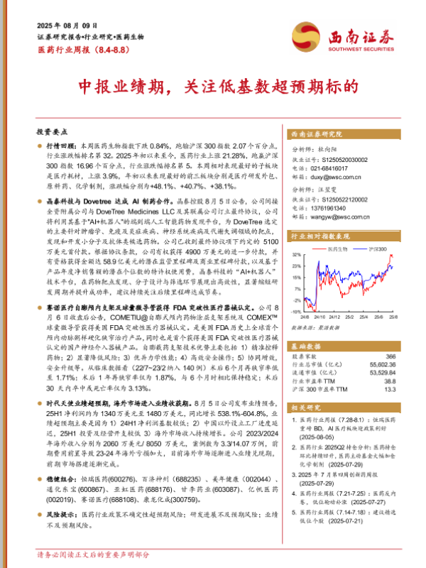 【西南证券】【20250809】医药行业周报(8.4~8.8):中报业绩期,关注低基数超预期标的-31页