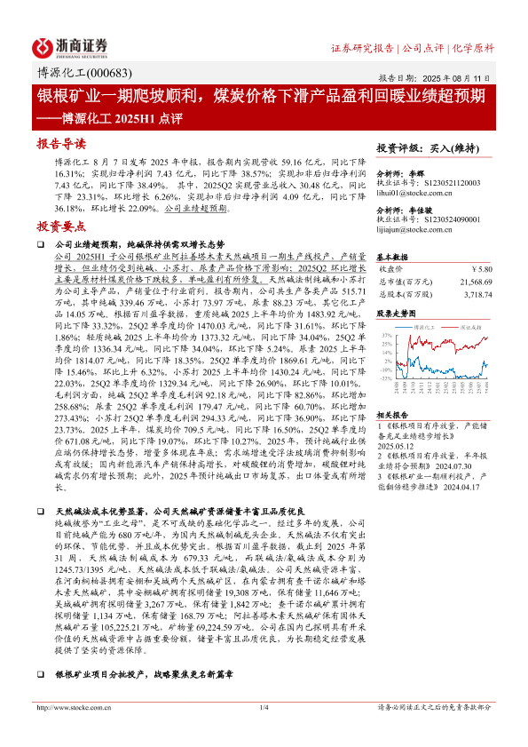 【浙商证券】【20250811】博源化工-2025H1点评:银根矿业一期爬坡顺利,煤炭价格下滑产品盈利回暖业绩超预期-4页