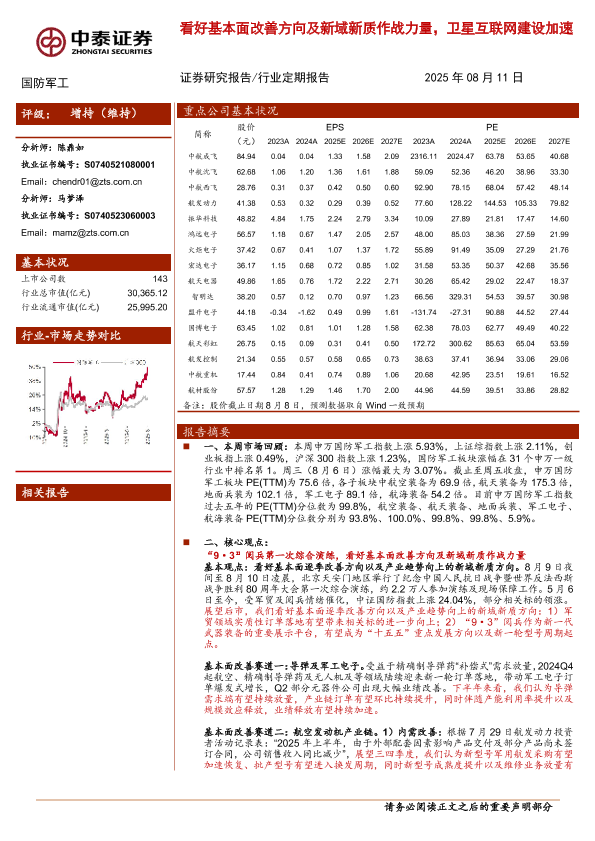 【中泰证券】【20250811】看好基本面改善方向及新域新质作战力量,卫星互联网建设加速-19页