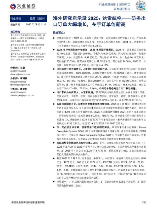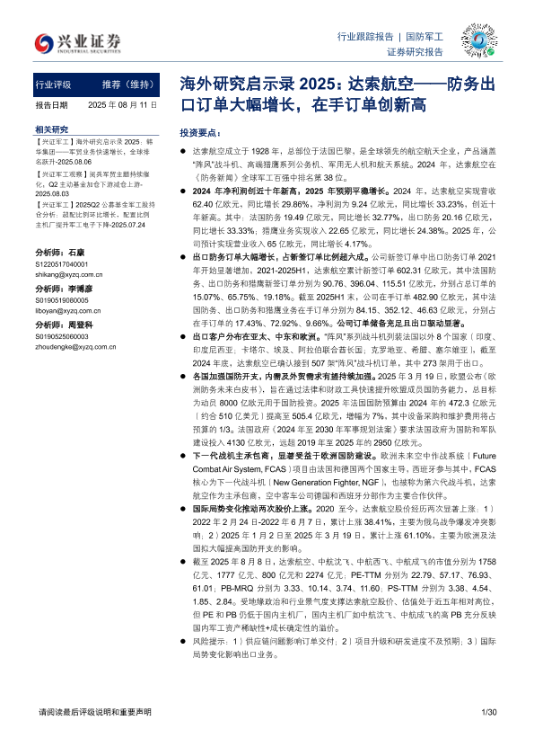 【兴业证券】【20250811】海外研究启示录2025,达索航空——防务出口订单大幅增长,在手订单创新高-30页