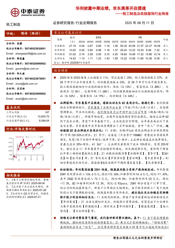 【中泰证券】【20250811】轻工制造及纺服服饰行业周报:华利披露中期业绩,京东奥莱开店提速-18页