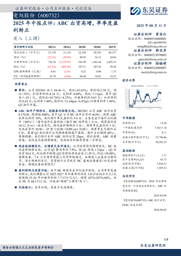 ABC组件 光伏设备 盈利预测 爱旭股份 定增