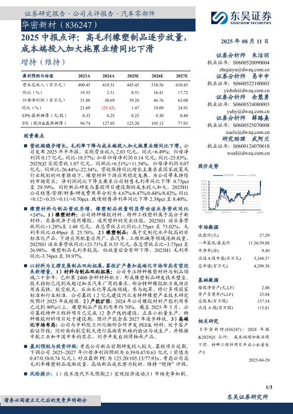 【东吴证券】【20250811】华密新材2025中报点评:高毛利橡塑制品逐步放量,成本端投入加大拖累业绩同比下滑-3页