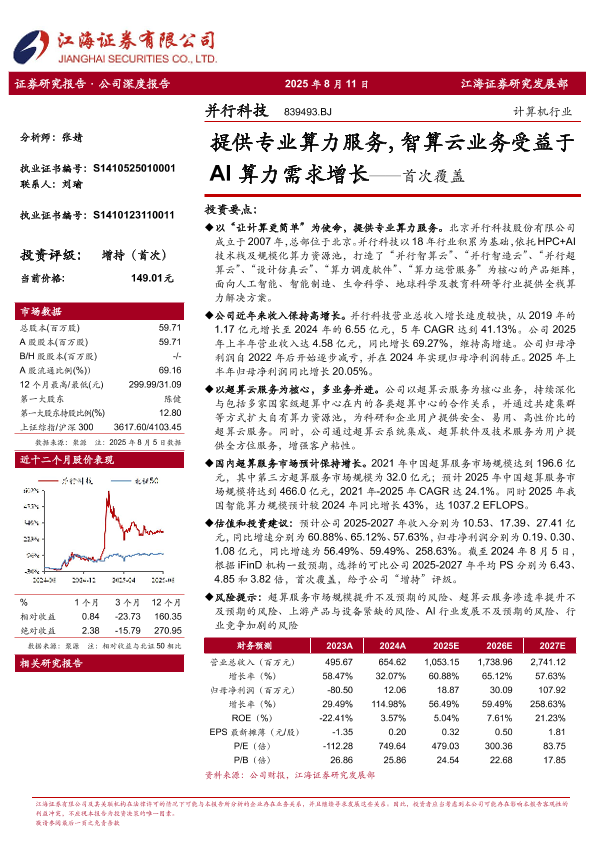 AI算力 算力服务 并行科技 超算云 首次覆盖