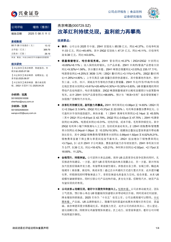 【兴业证券】【20250811】燕京啤酒:改革红利持续兑现,盈利能力再攀高-4页