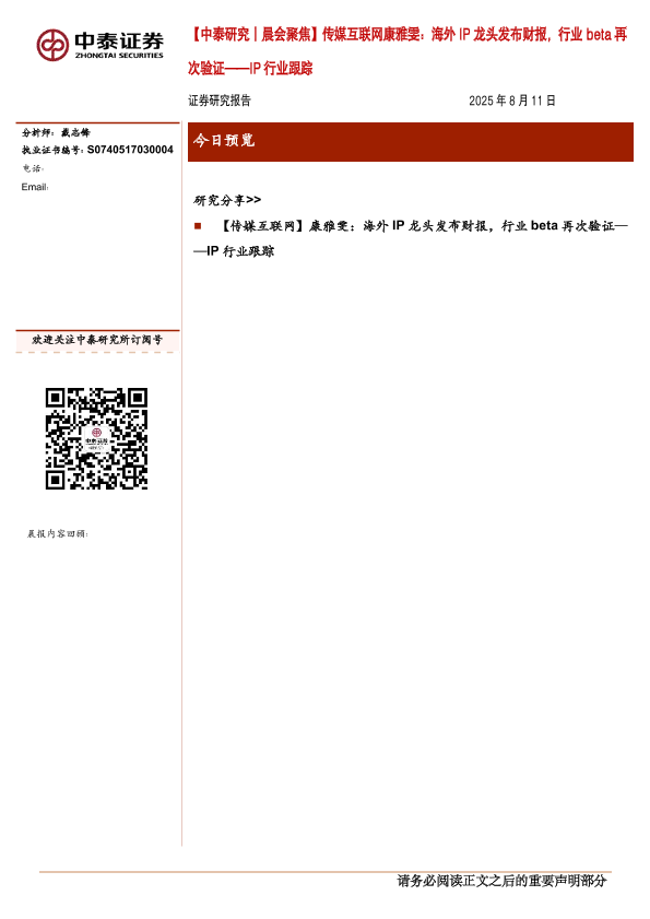 【中泰证券】【20250811】晨会聚焦:海外 IP龙头发布财报,行业 beta再次验证——IP行业跟踪-3页