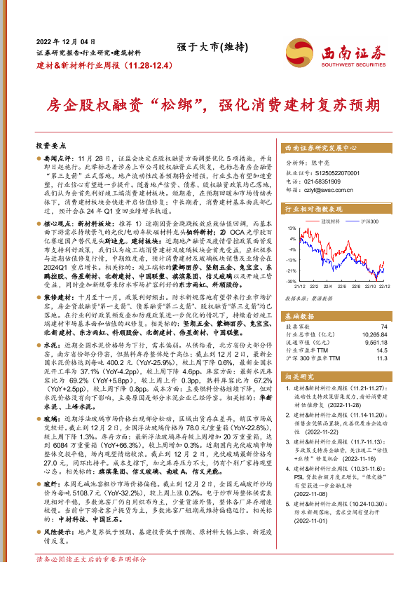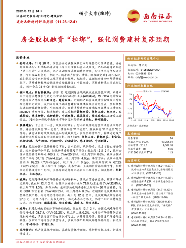 【西南证券】【20221204】建材&新材料行业周报:房企股权融资“松绑”,强化消费建材复苏预期-20页
